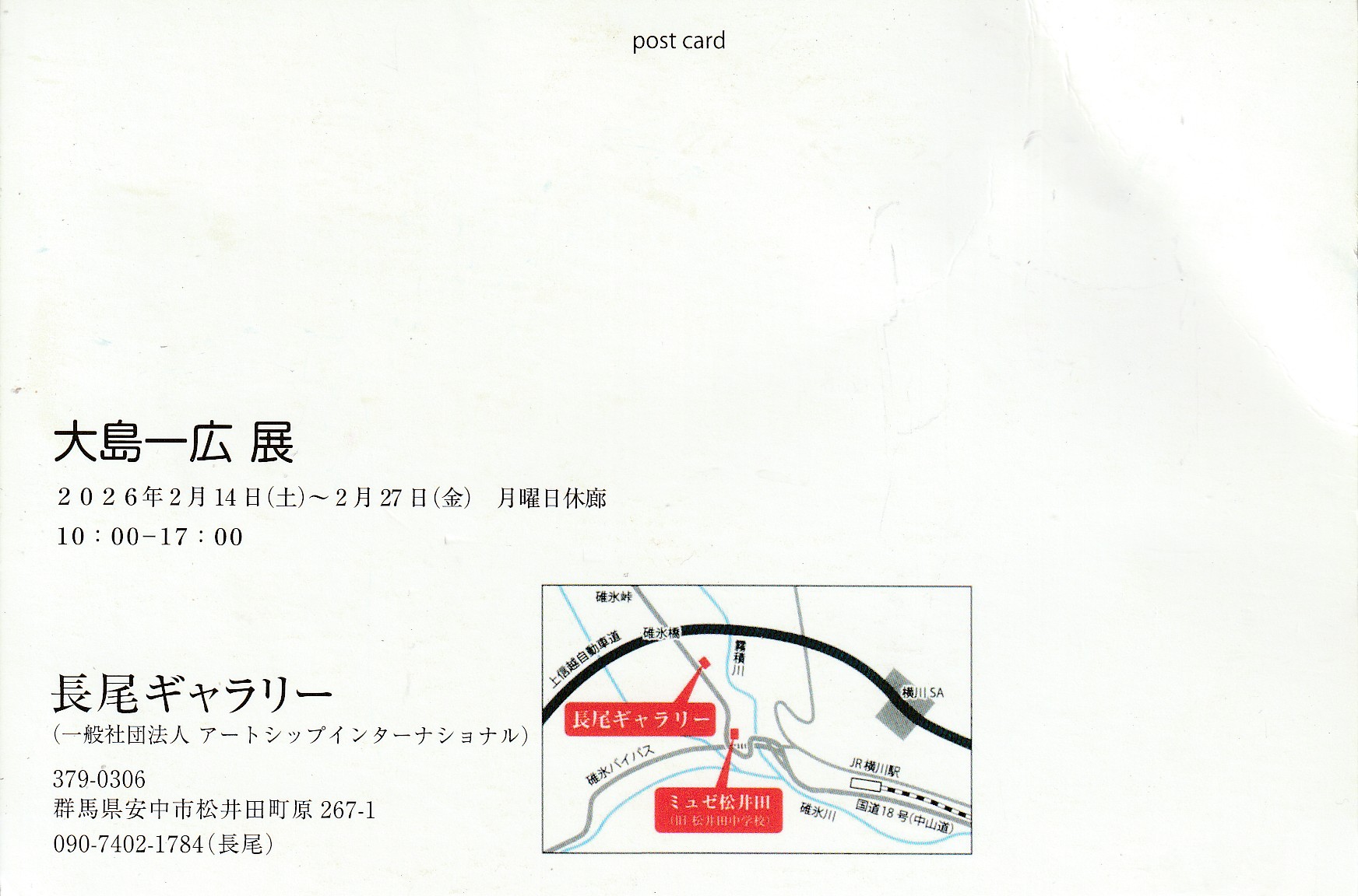 大島一弘 展 ~足立のピカソ 世界へ~ 2/14から 【日時】2026年2月14日(土)~2月27日(金)月曜日休廊 10:00~17:00 【場所】長尾ギャラリー(社団法人アートシップインターナショナル) 〒379-0306 群馬県安中市松井田町原267-1 【お問い合わせ】090-7402-1784(長尾)